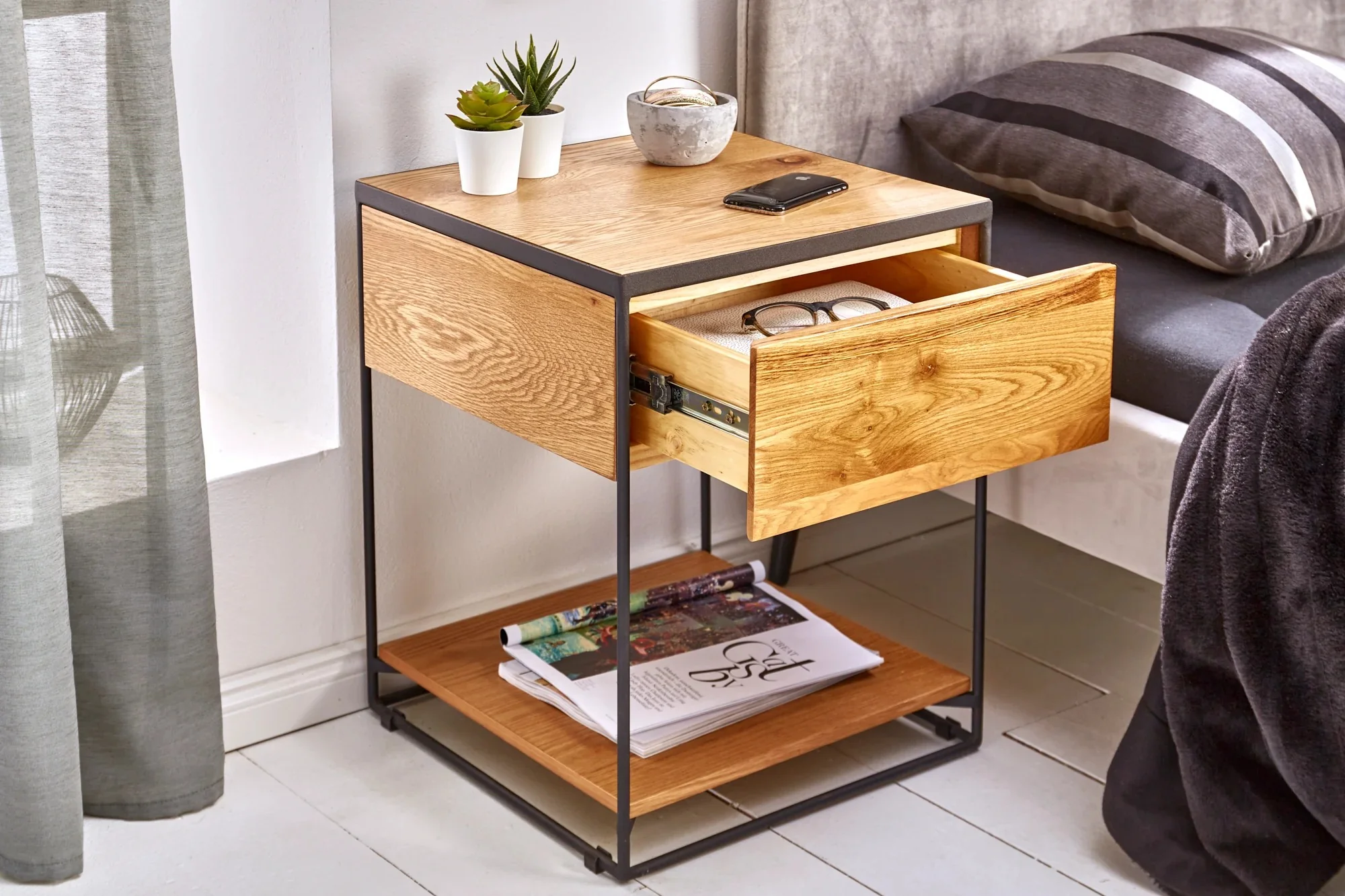 - Single drawer for discreet storage of bedside essentials