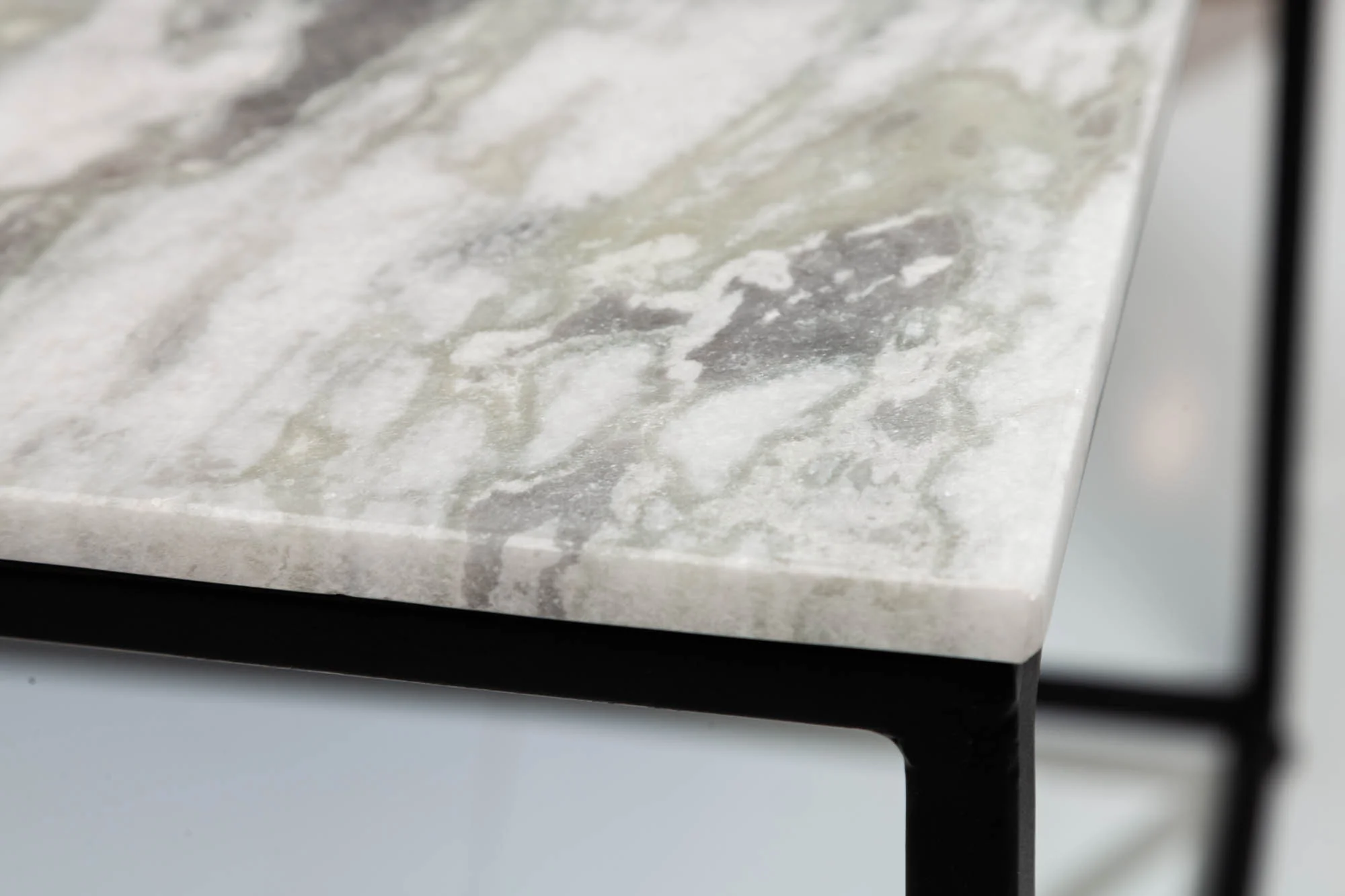 The Elements 50cm high coffee table features a timeless, elegant white marble tabletop and a contemporary black metal frame. Each example showcases a unique grain and pattern, making every Elements coffee table beautifully unique.