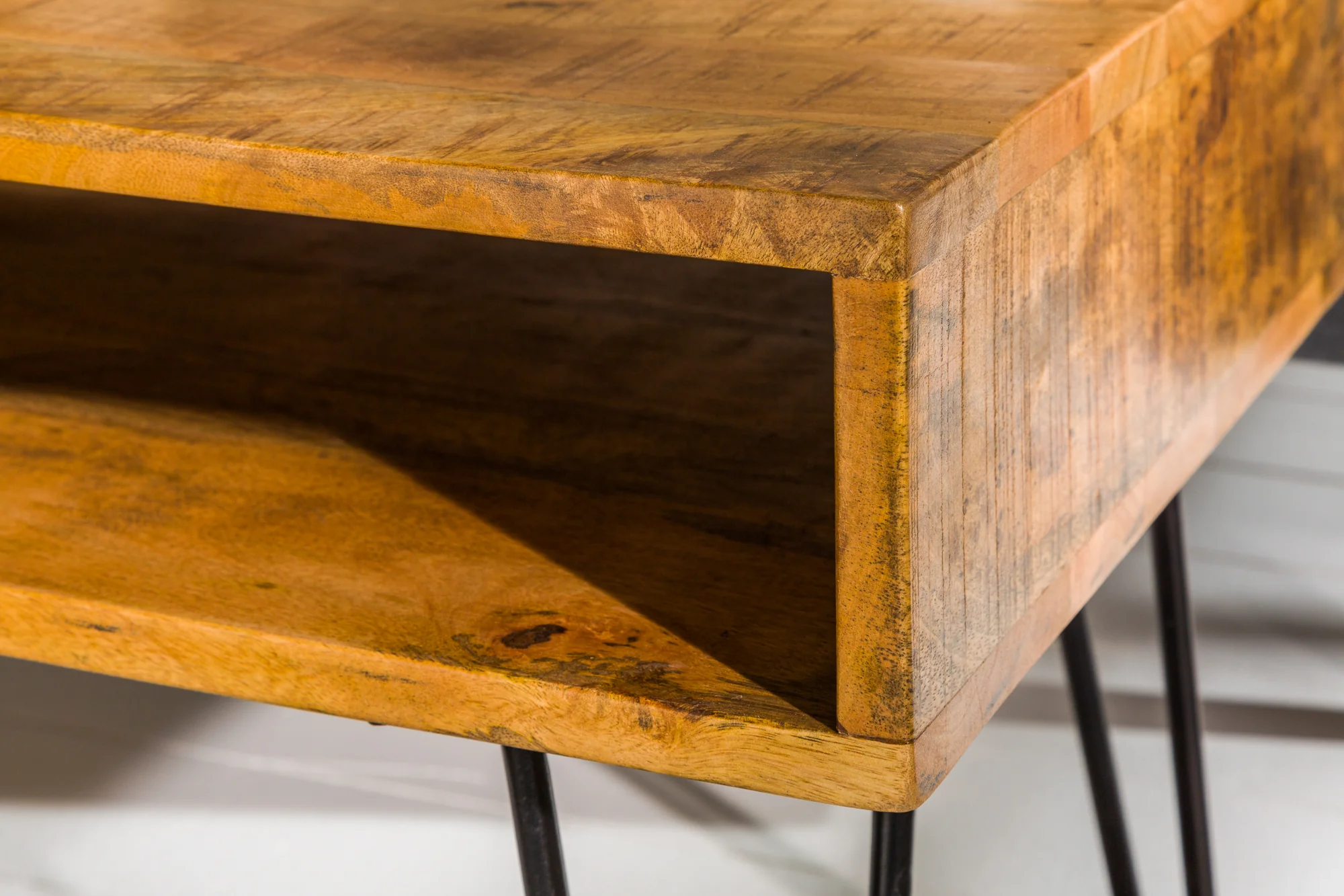A stylish mango wood coffee table with a lower shelf and industrial hairpin legs, ideal for adding warmth and functionality to your living space.
