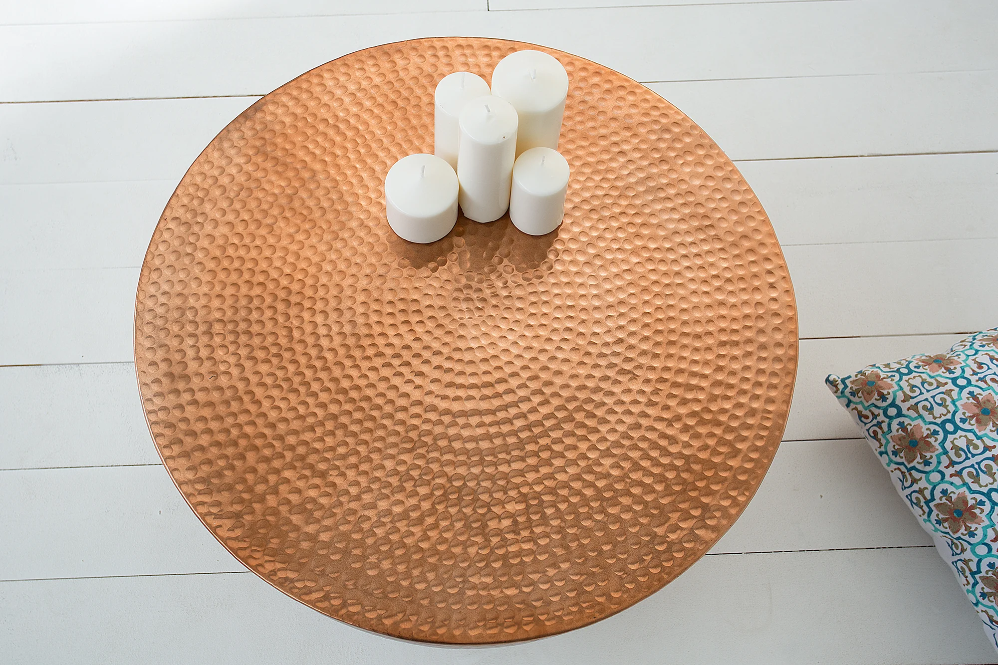 Measuring 60cm in diameter, this coffee table features an elegant hammered copper design crafted from aluminium, creating a warm and inviting focal point for your home.