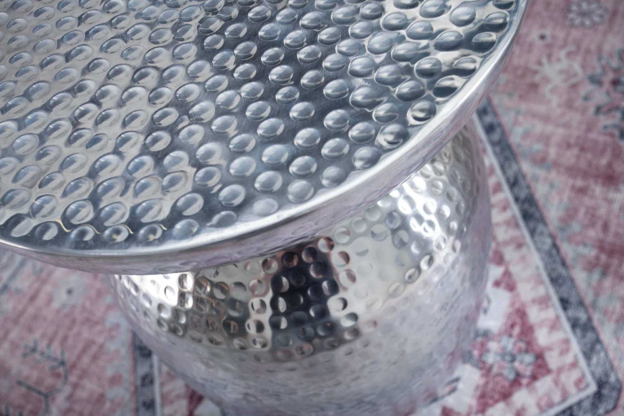 The Orient round side table in silver brings artisanal charm to any space. Featuring a hand-hammered metal surface, this table showcases unique textures that create a captivating play of light.