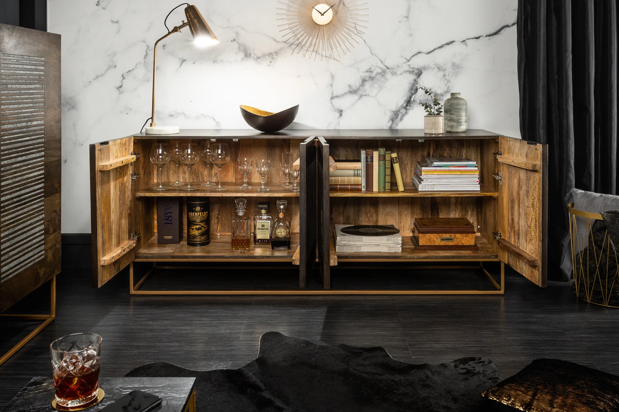 The gold metal frame enhances its elegance while providing sturdy support. With spacious compartments and shelves, the Obsidian sideboard is perfect for storing tableware, books, or decorative items, making it a practical yet stylish addition to your home.