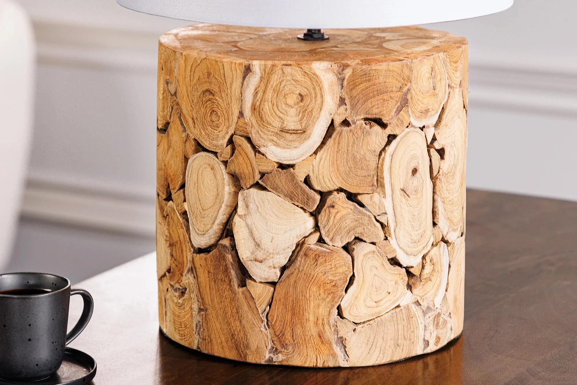 Each lamp is unique, showcasing the natural grain and character of the wood, making it not only a functional lighting source but also a true work of craftsmanship. The white fabric shade complements the robust wooden base, diffusing the light into a warm, inviting glow that enhances the atmosphere of any room.