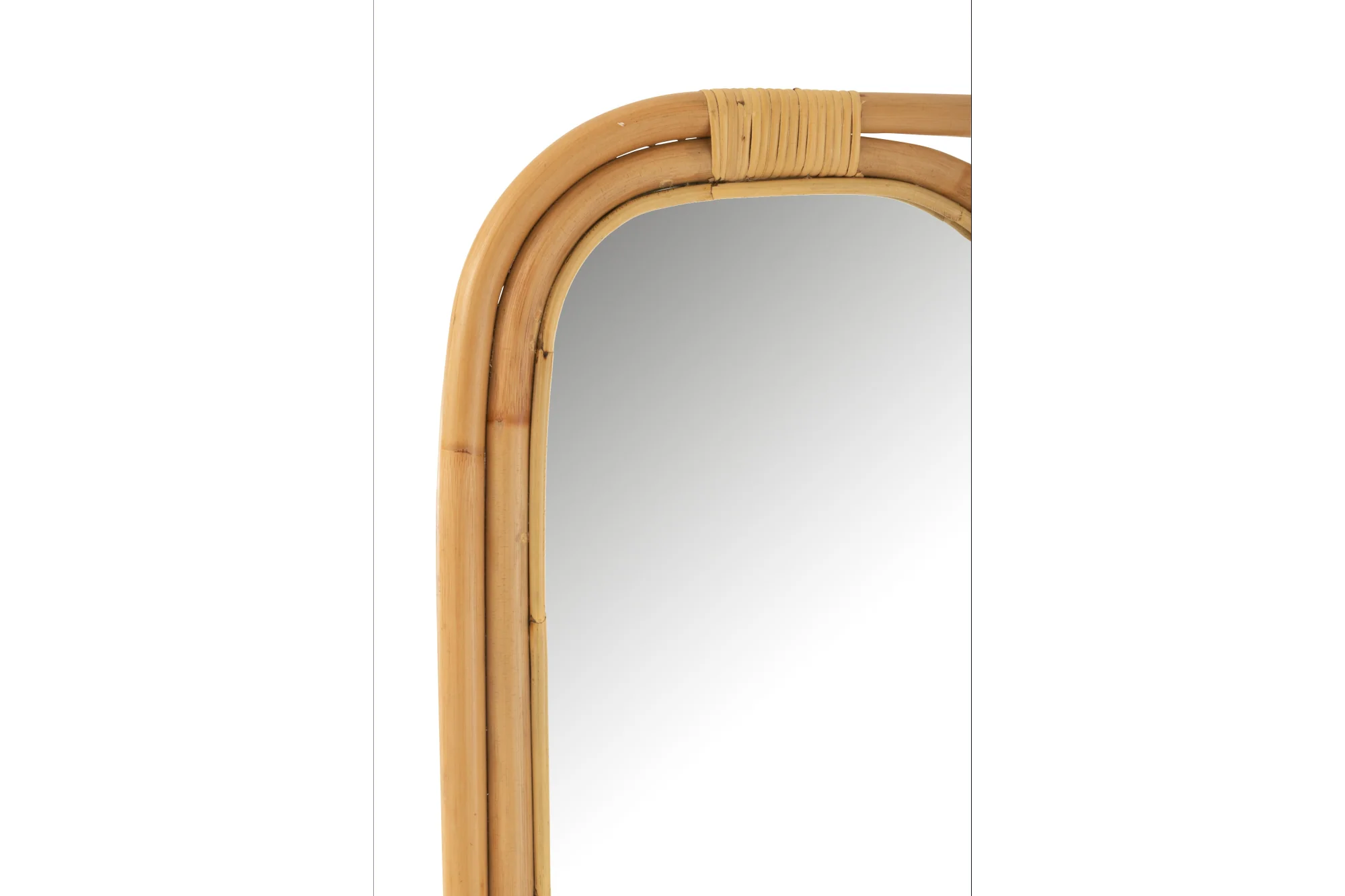 Crafted from rattan in a natural finish, this rectangular mirror with rounded corners embraces boho and rustic style. Along one side, a unique ladder-inspired detail with slim bars offers extra function—perfect for hanging light clothing, scarves or accessories.